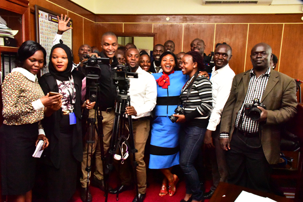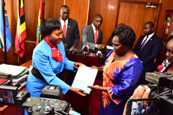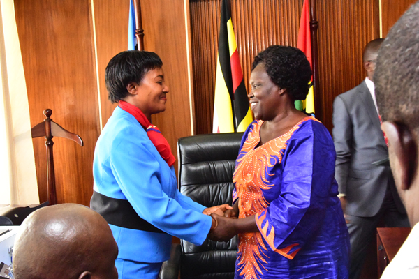 The outgoing LoP Winfred Kiiza hands over office to the new LoP Betty Aol Ocan on 14th August 2018